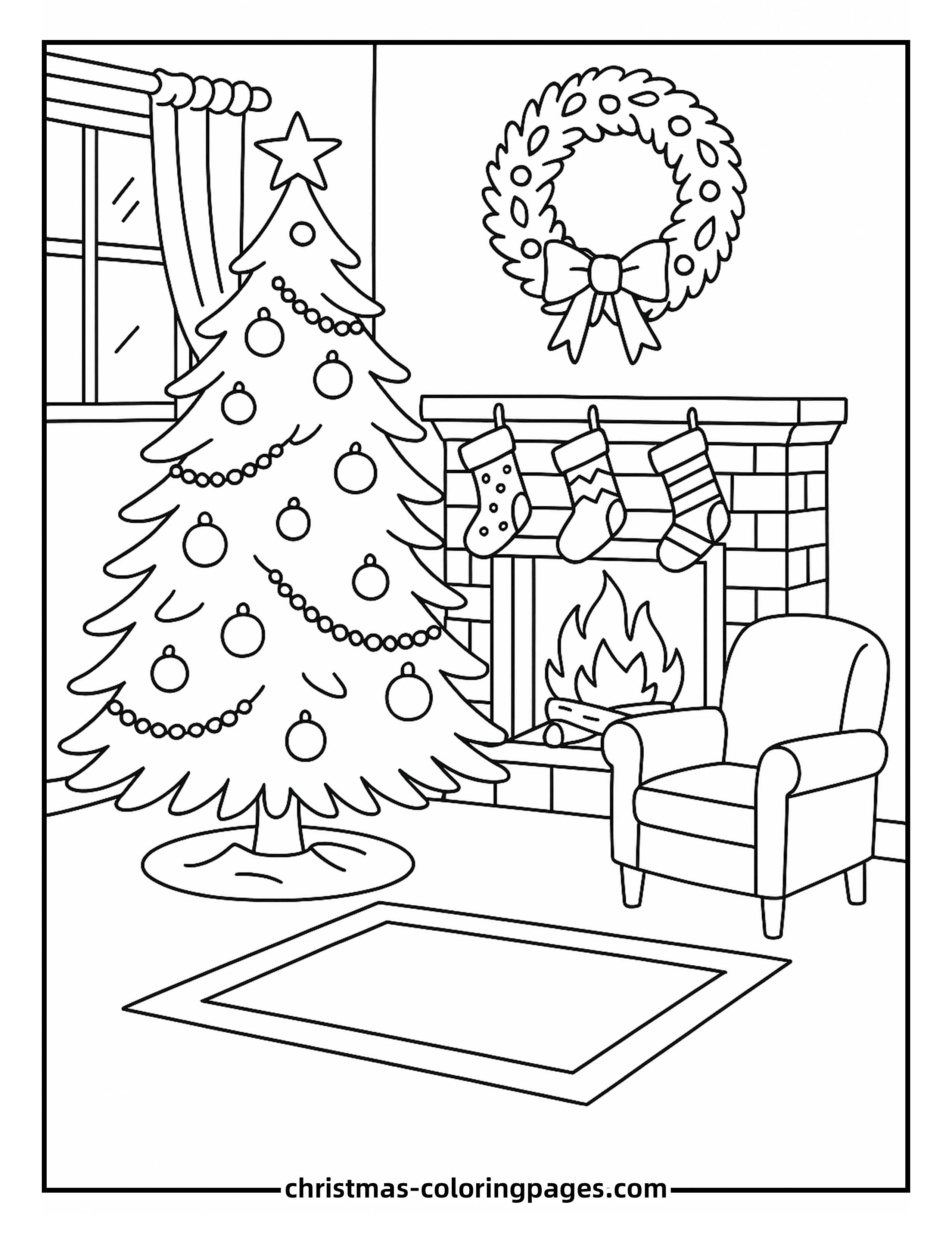 This Cozy Fireplace Christmas Tree Coloring Page brings the warmth and charm of the holidays to life. The scene features a beautifully decorated Christmas tree standing beside a glowing fireplace, with stockings hanging and a wreath above the mantel. Children can color the soft firelight, shiny ornaments, and cozy living room details to create a heartwarming Christmas atmosphere. Perfect for family coloring time, classroom projects, or relaxing winter afternoons, this printable sheet captures the magic of a traditional holiday home. It helps kids express creativity while celebrating togetherness, comfort, and joy. Download and print this detailed Christmas coloring page to add warmth and festive cheer to your art collection.
