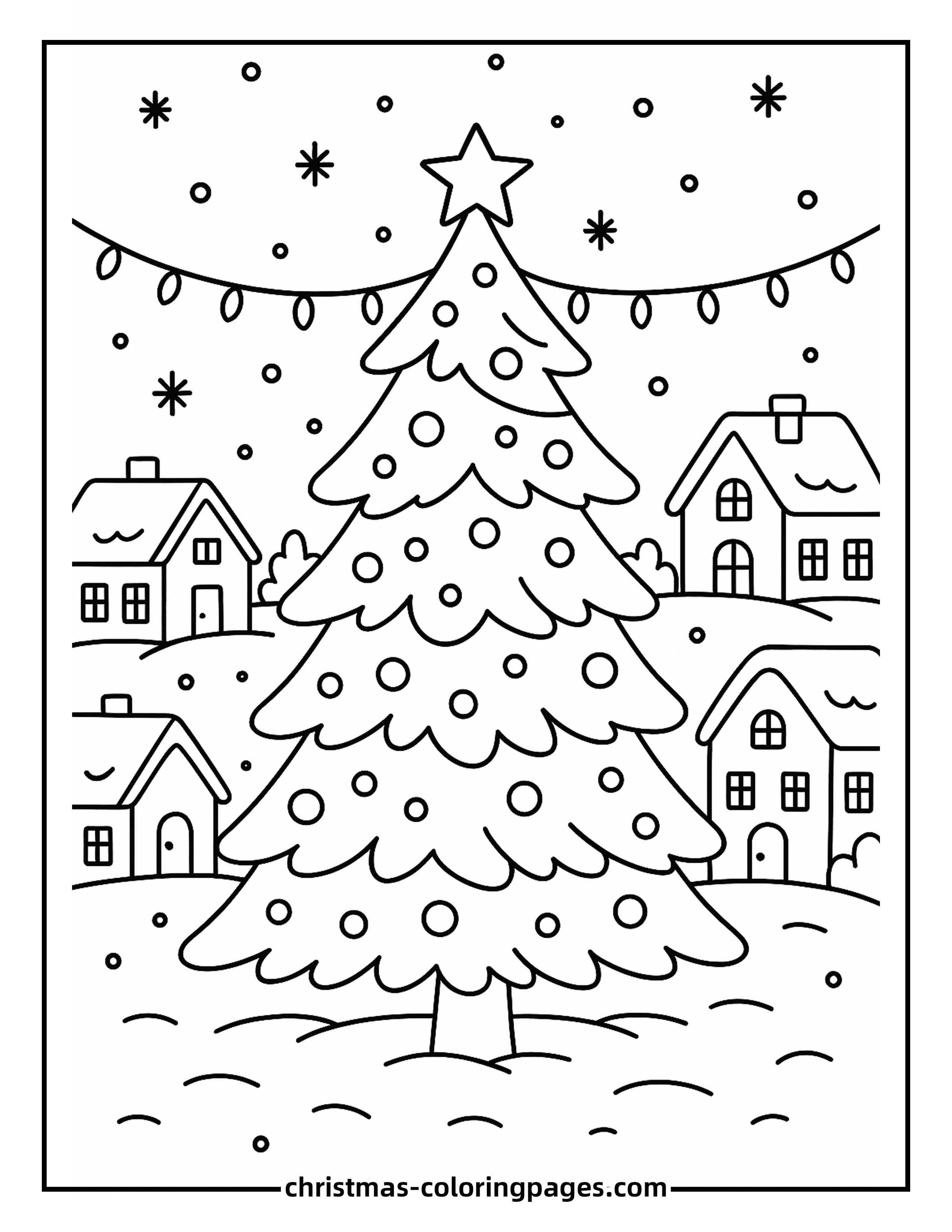 This Village Square Christmas Tree Coloring Page captures the peaceful joy of a snowy holiday evening. In the center of a charming village, a tall Christmas tree stands proudly, surrounded by cozy cottages, glowing lanterns, and falling snow. Children can color the warm lights, snow-covered rooftops, and festive decorations to bring this magical winter scene to life. It’s a perfect printable coloring page for kids who love Christmas towns and outdoor holiday fun. Ideal for family crafts, school art projects, or cozy evenings at home, this page celebrates togetherness and the beauty of small-town Christmas traditions. Download and print it to fill your holidays with creativity and cheer!