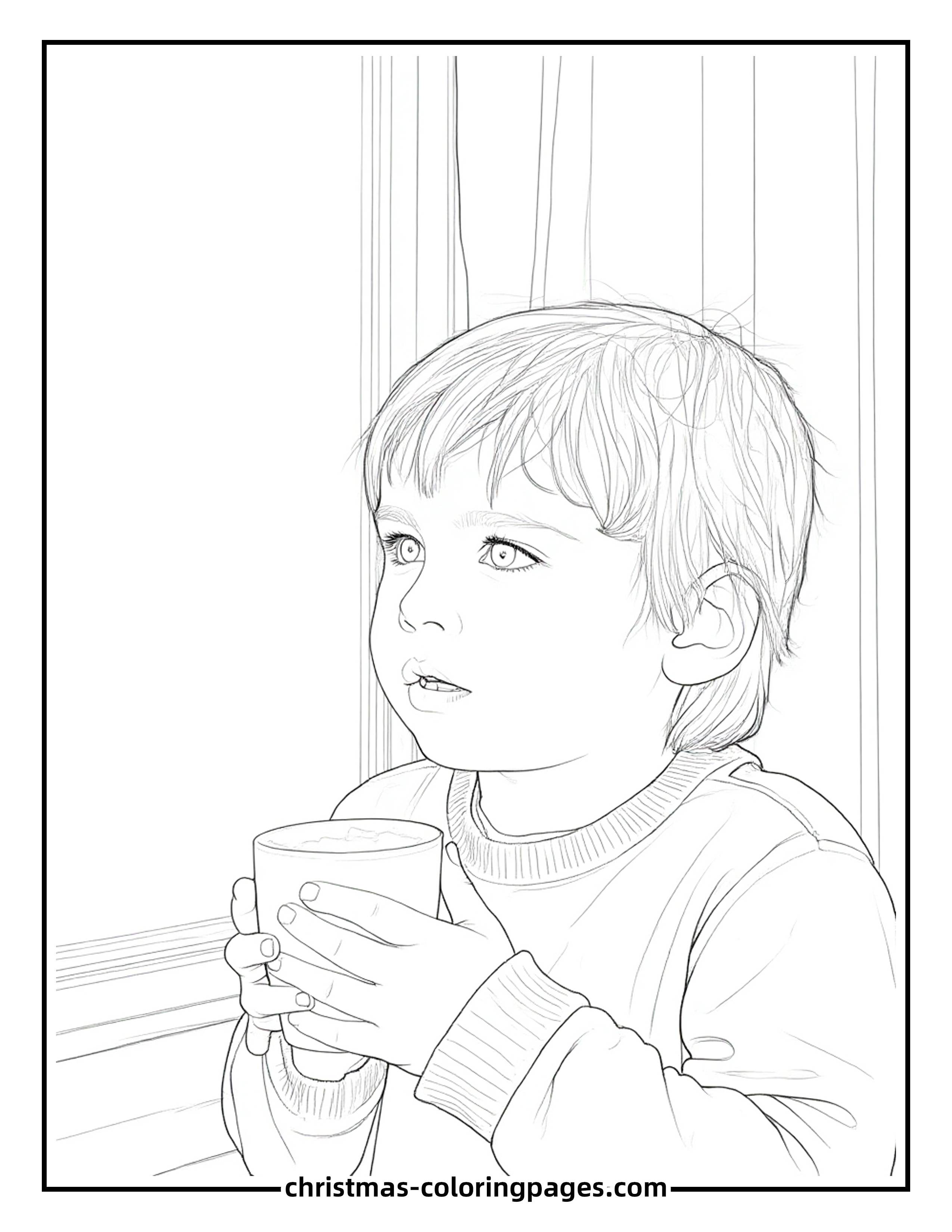 This peaceful Easy Christmas Coloring Pages illustration shows a child sitting by the window, holding a warm cup of hot cocoa while watching snowflakes fall; the simple lines and gentle details make it ideal for young artists and family holiday activities—download this printable from our christmas coloring pages collection to add a cozy, creative moment to your festive season.
