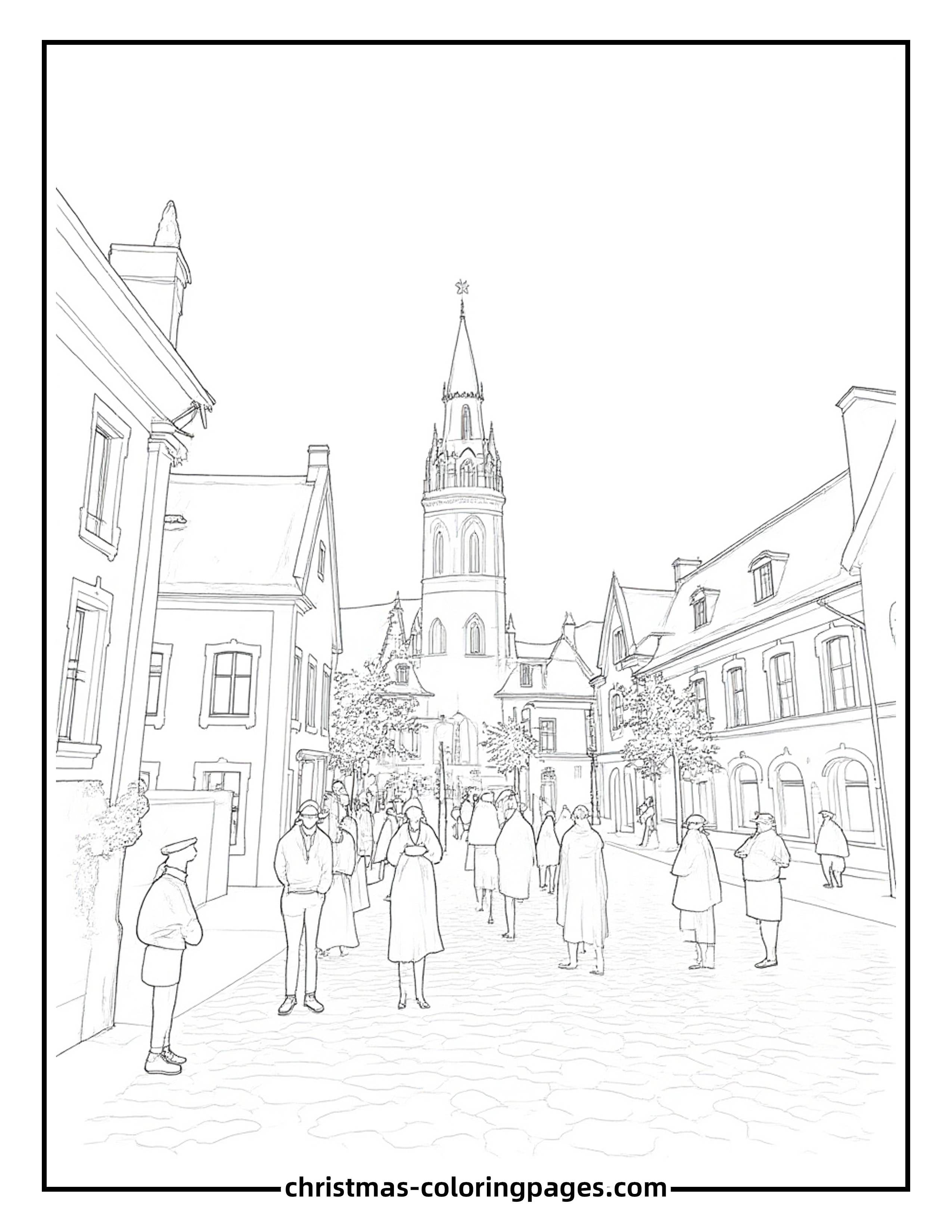Bring the warmth of the season to life with this christmas coloring pages scene of a charming Christmas village at dusk. The softly glowing windows and joyful people singing carols make it a perfect relaxing activity for kids to color during wintertime celebrations.