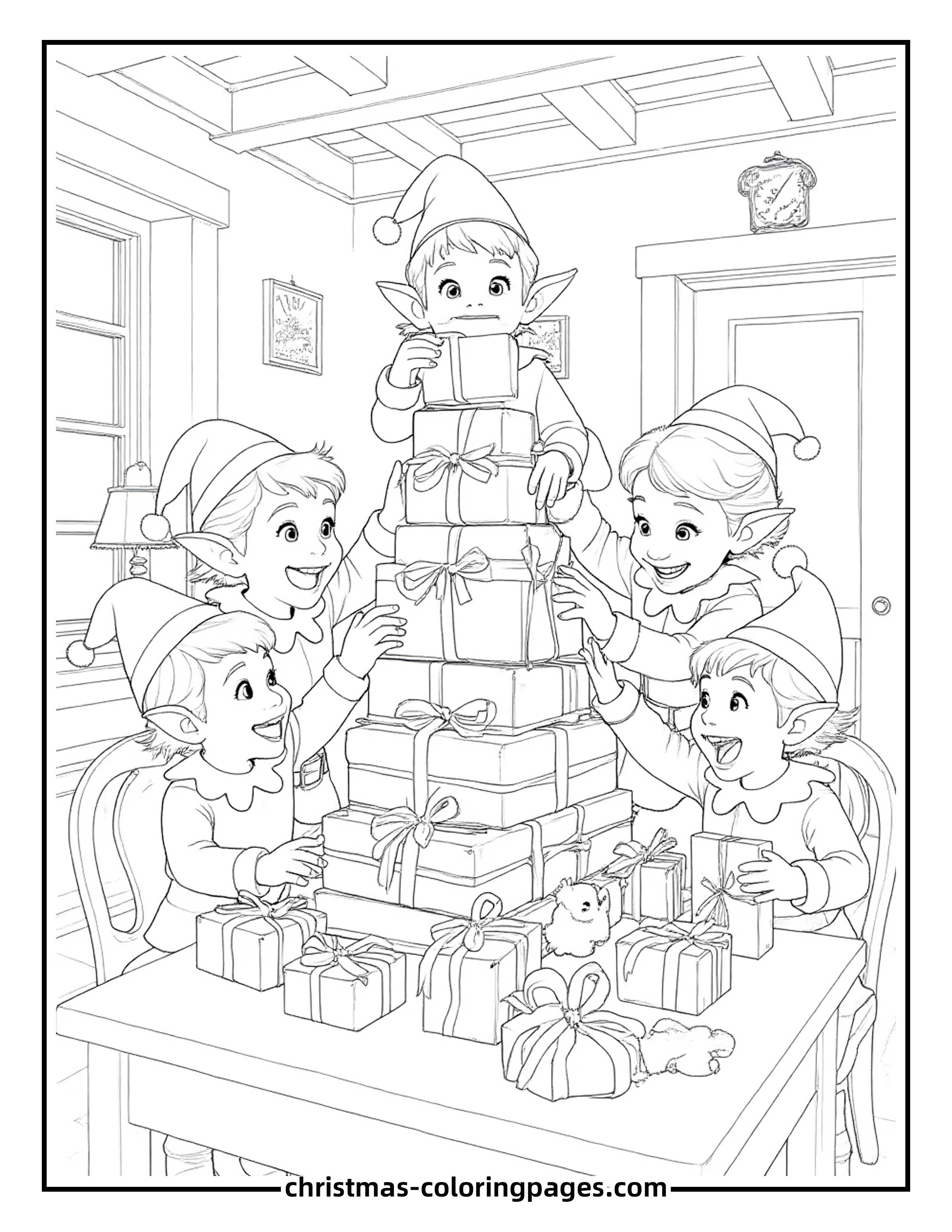 - Easy Christmas Coloring Pages – Elves Stacking Presents