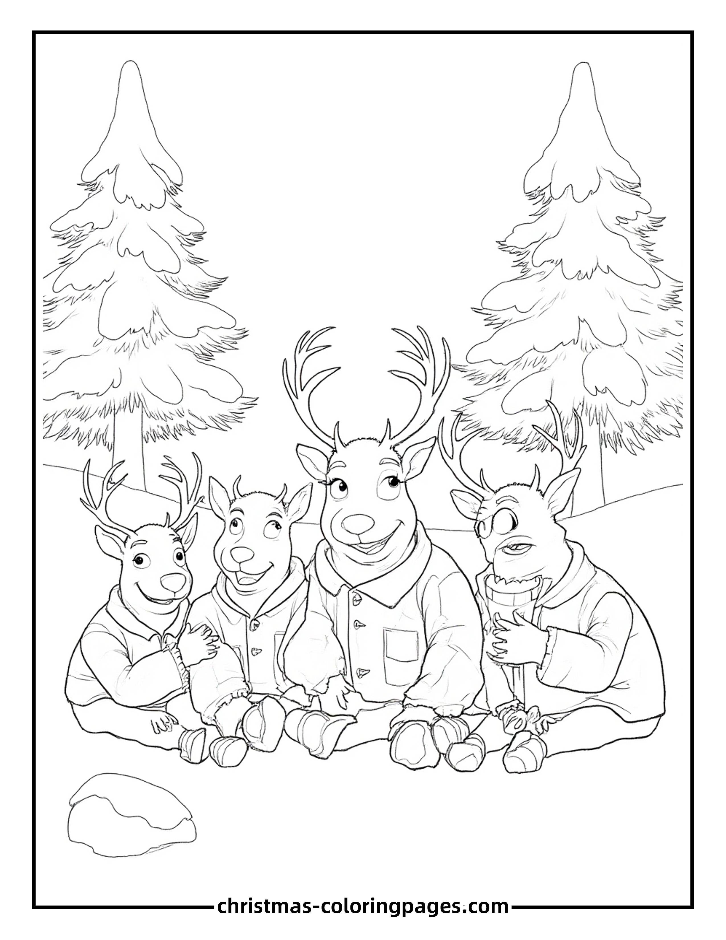 This tranquil christmas coloring pages picture shows a happy family of reindeer resting near a pine forest blanketed in snow. Kids can enjoy coloring this calm winter moment while learning about nature and the spirit of Christmas.