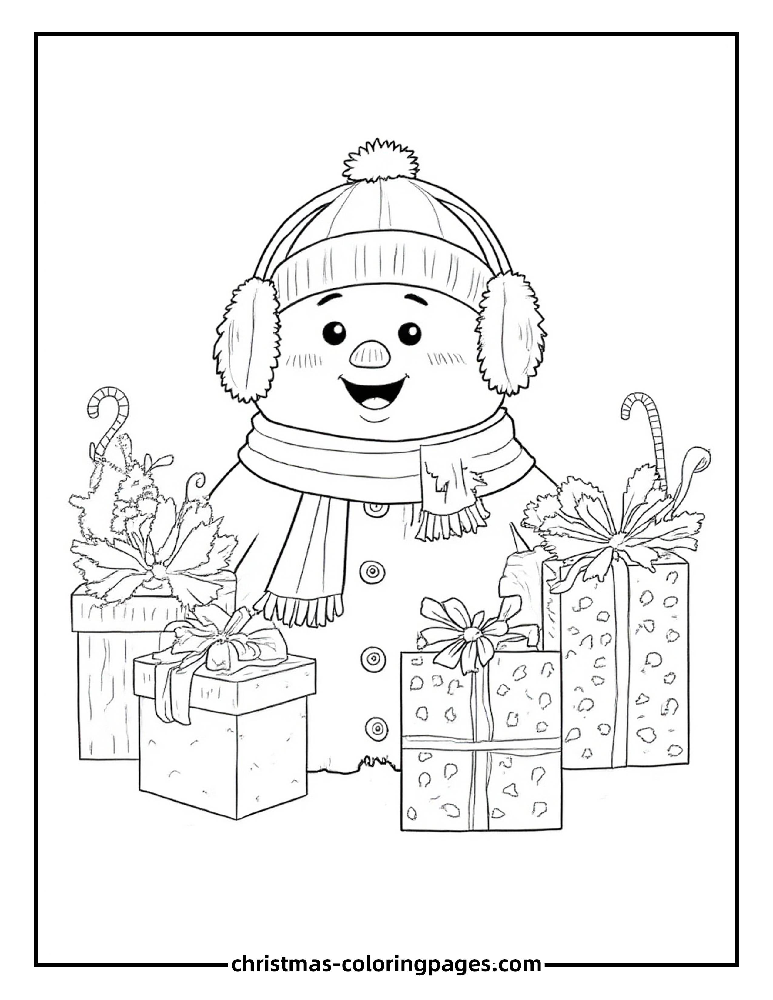 Easy Christmas Coloring Pages – Snowman with Presents and Candy Canes