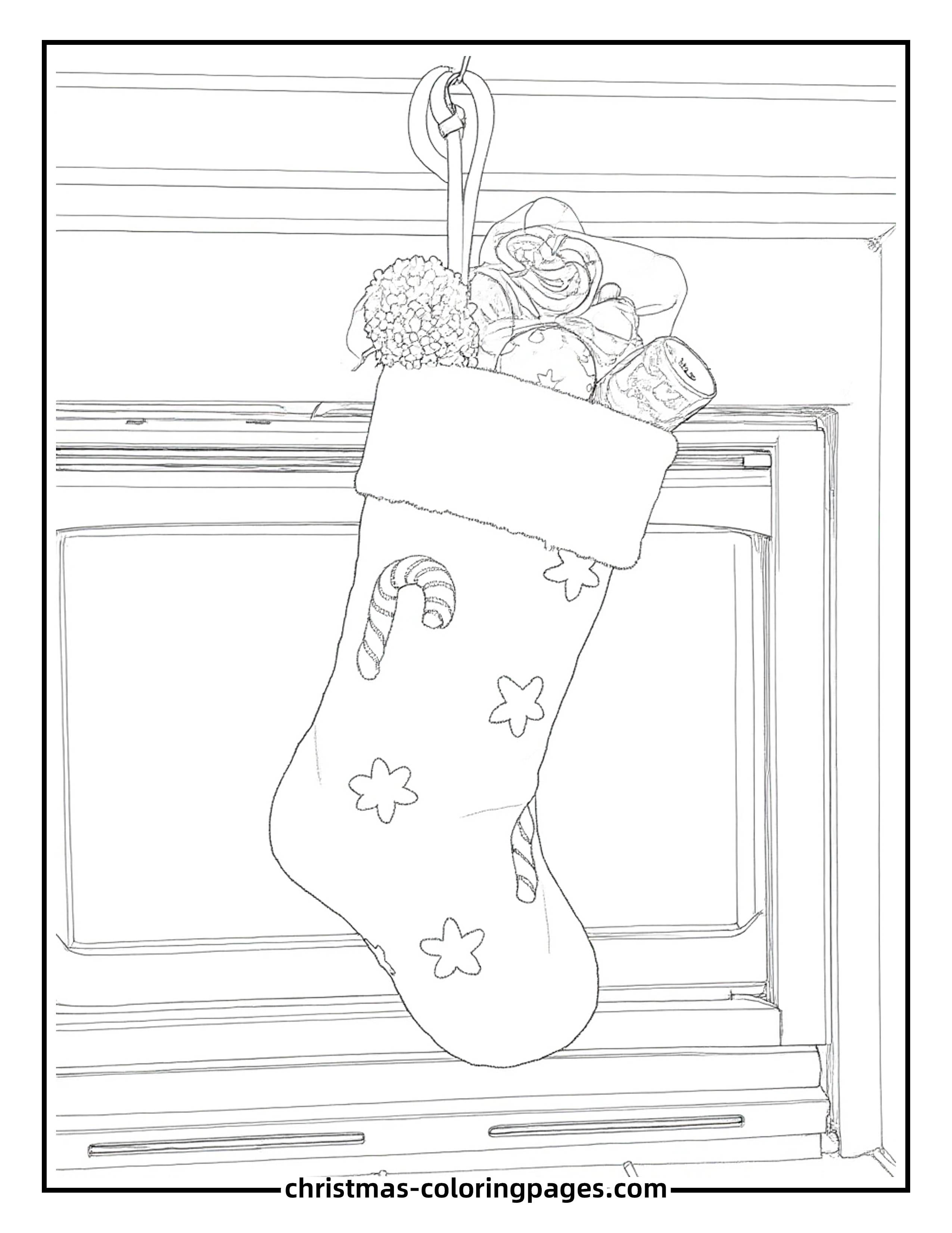 This christmas coloring pages artwork features a cozy stocking hanging by the fireplace, filled with candy canes, toys, and tiny presents. It’s an easy and festive coloring sheet that captures the excitement of Christmas morning for every child.