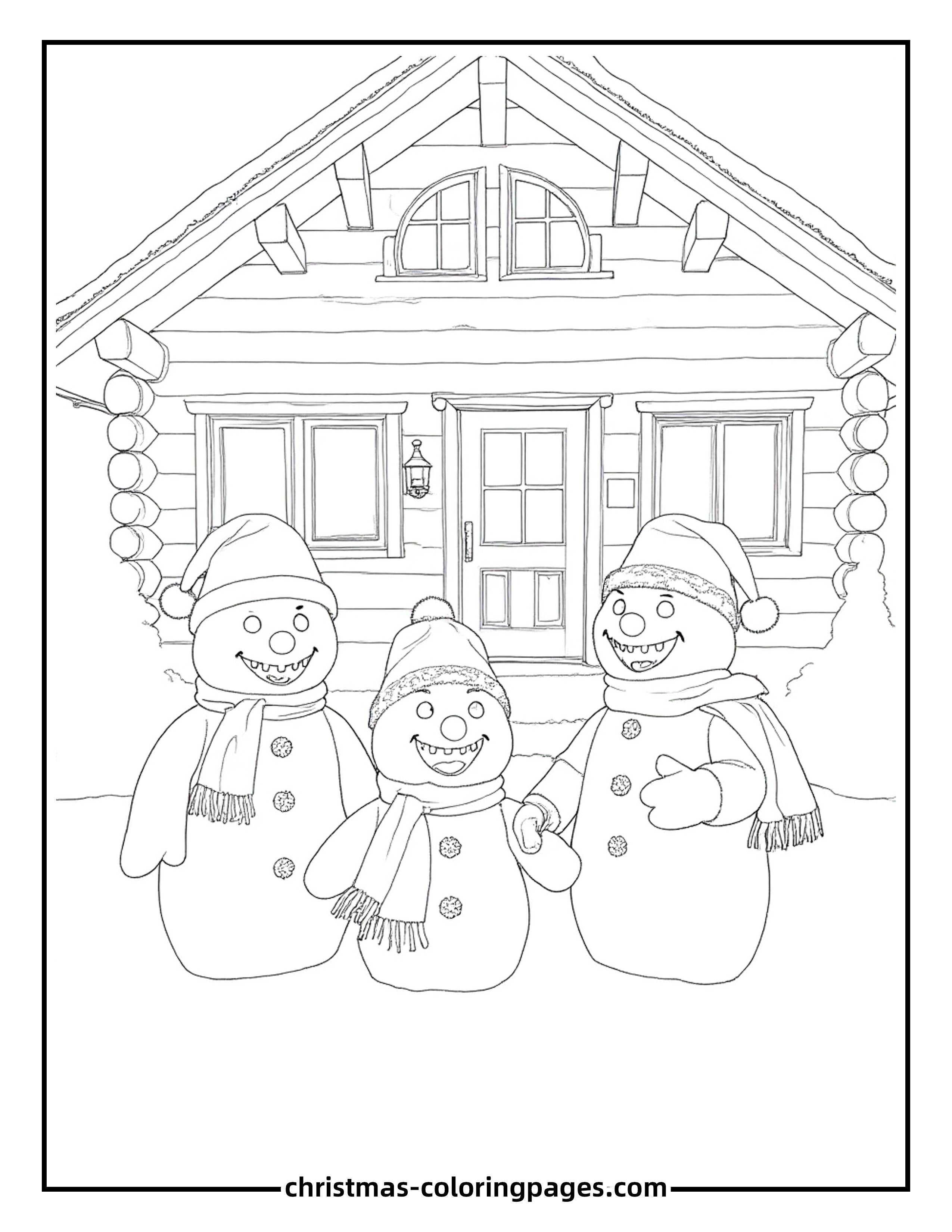 Easy Christmas Coloring Pages – Snowman Family by Cabin