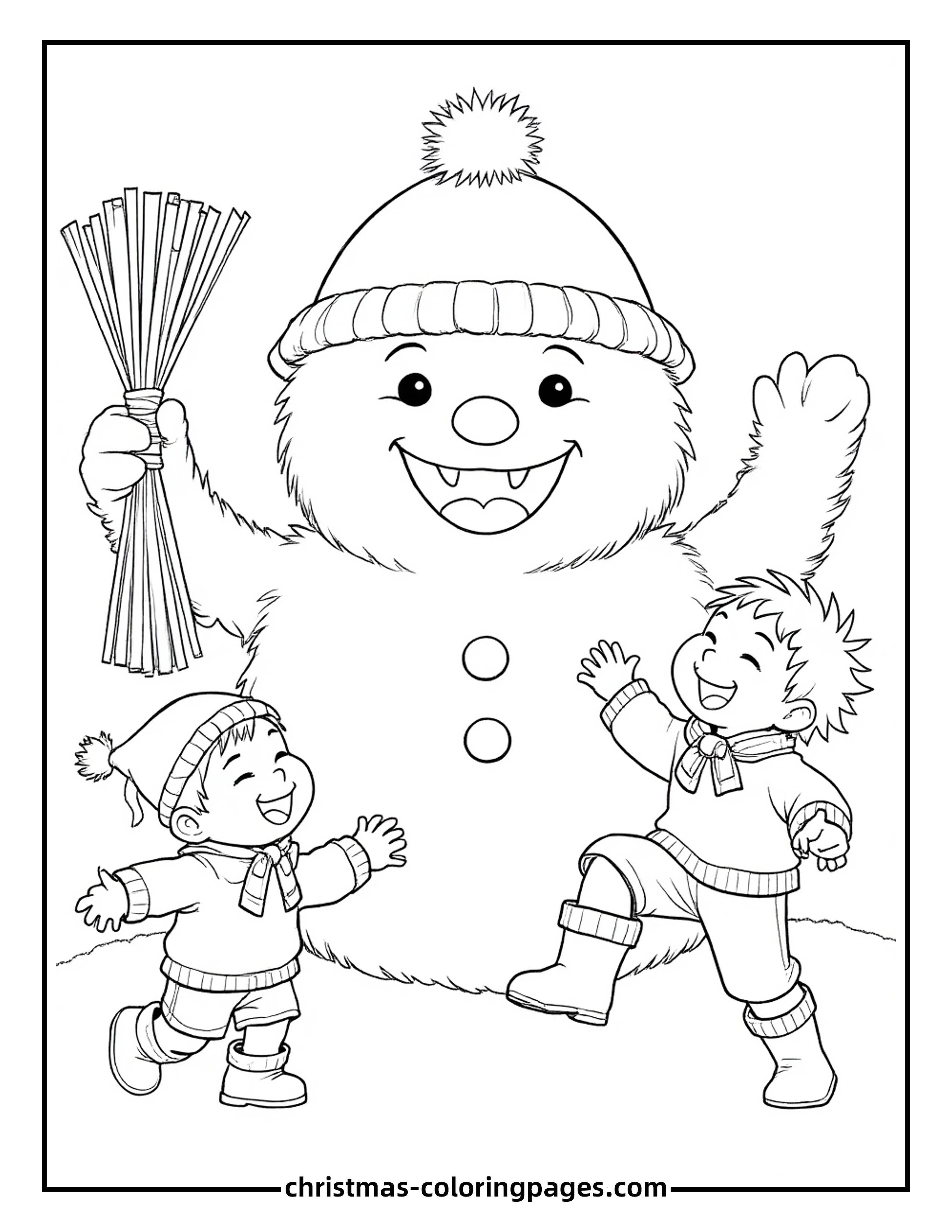 Easy Christmas Coloring Pages – Kids Playing with Snowman