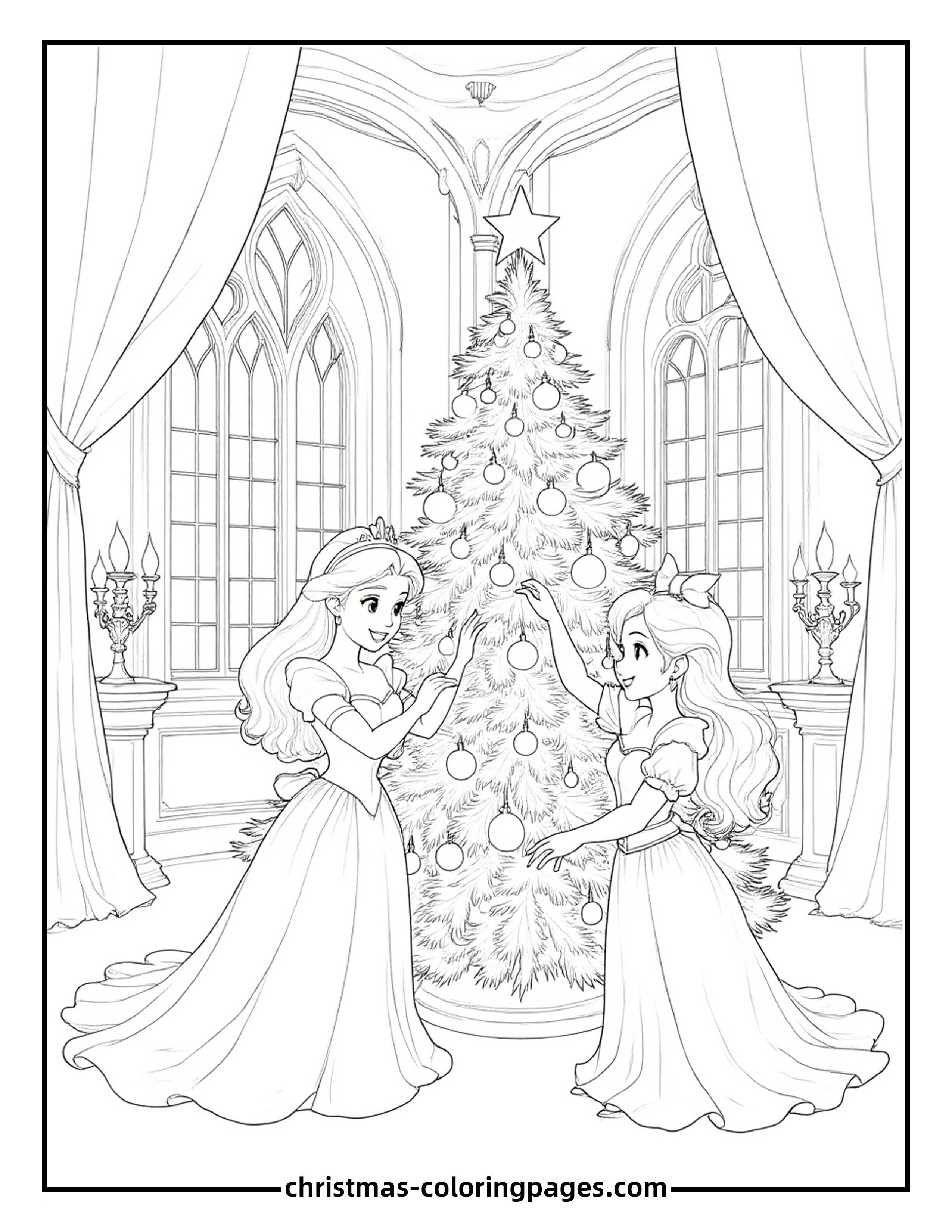 Step into the Disney princess castle for a magical Christmas evening! This Disney Christmas Coloring Page shows Cinderella and Prince Charming decorating a sparkling Christmas tree while the lights shimmer outside the window. The cozy castle setting brings warmth and fairy-tale beauty to your holiday. Discover more enchanting designs in our christmas coloring pages gallery and make your coloring time magical.
