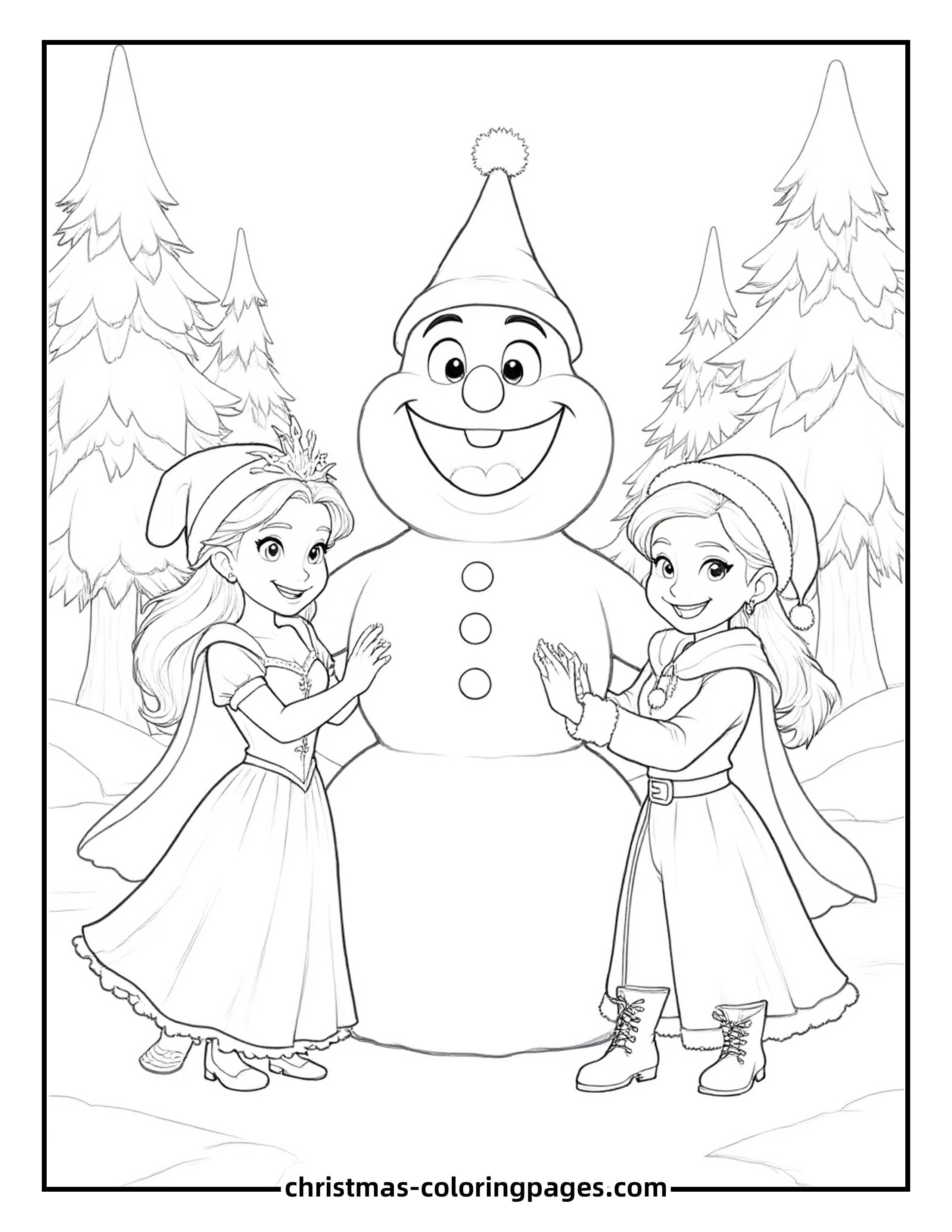 Let it snow with this delightful Frozen-themed Disney Christmas Coloring Page! Elsa and Anna build a giant snowman while Olaf happily poses nearby, surrounded by snowy trees and Christmas sparkle. It’s a joyful winter moment perfect for Frozen fans and holiday fun. Add this printable sheet to your christmas coloring pages collection and celebrate the magic of winter with your favorite Disney characters.