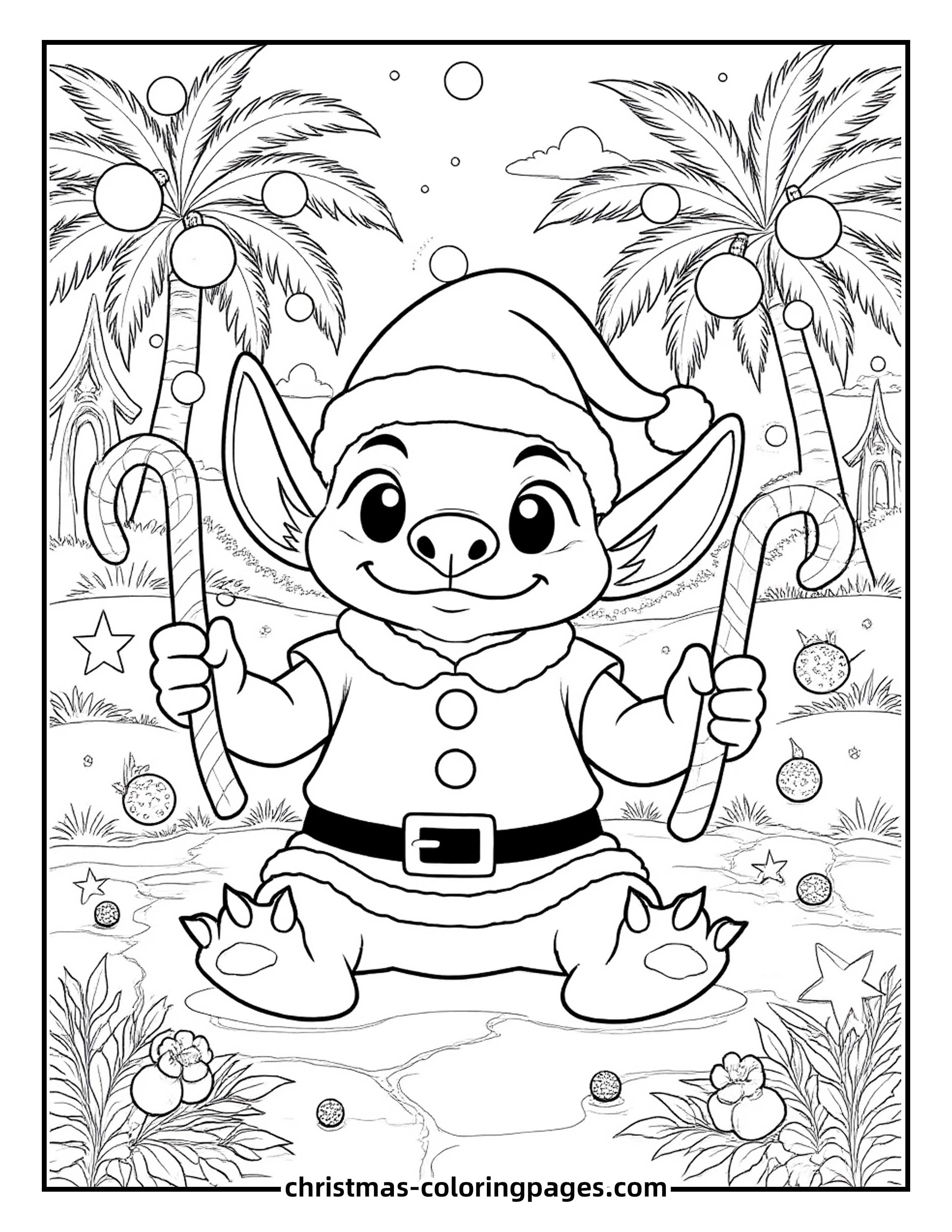 Get ready for a tropical Christmas with Stitch! This fun Disney Christmas Coloring Page shows Stitch spreading holiday cheer in his Santa hat and holding candy canes. Bright palm trees and festive lights make this printable coloring sheet perfect for adding a splash of Hawaiian Christmas joy.