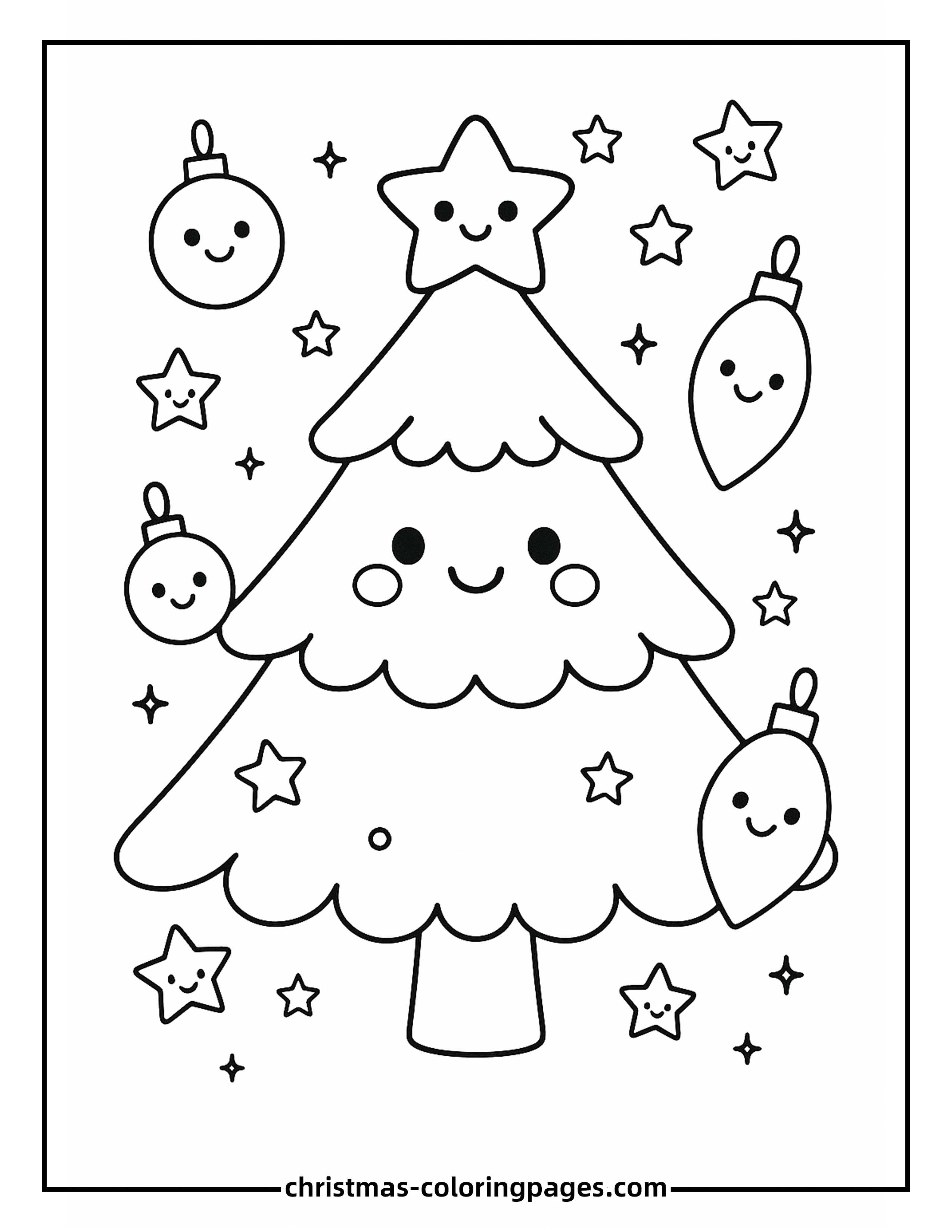 This charming kawaii Christmas page features a cheerful tree with a smiling face, surrounded by happy ornaments, twinkling stars, and candy decorations. Children can fill the page with bright greens, reds, and yellows to bring it to life. The large, soft lines make it ideal for young colorists, while the cute expressions encourage creativity and joy. Perfect for adding a dose of festive cuteness to the holidays!